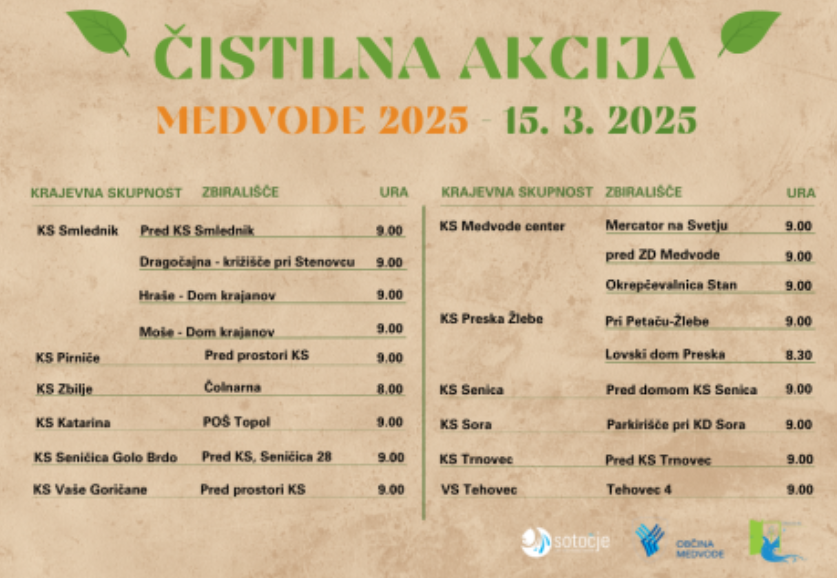 obveščamo Vas, da bo v soboto, 15. marca 2025, potekala delovna sobota (RS: 8.30-12.10 in PS: 8.30-13.00) na naši šoli (nadomeščamo odpadli pouk 24. 12. 2024). Poleg tega bo na ta dan organizirana tudi Medvoška čistilna akcija, kjer bomo skupaj s krajevno skupnostjo pobirali odpadke.