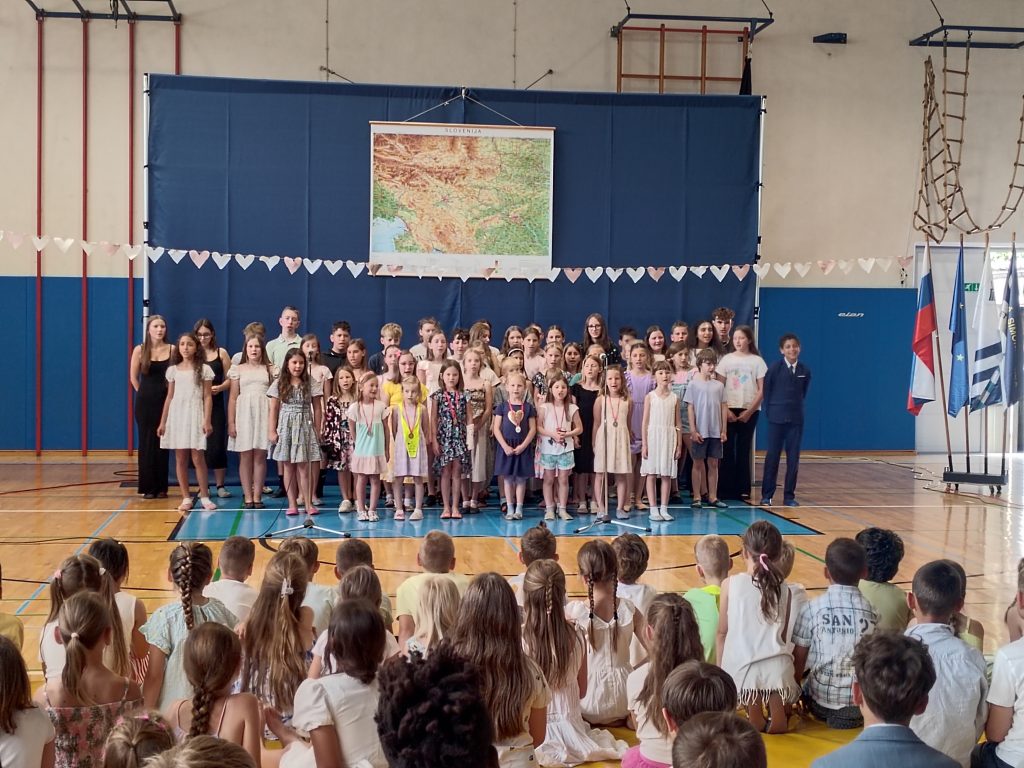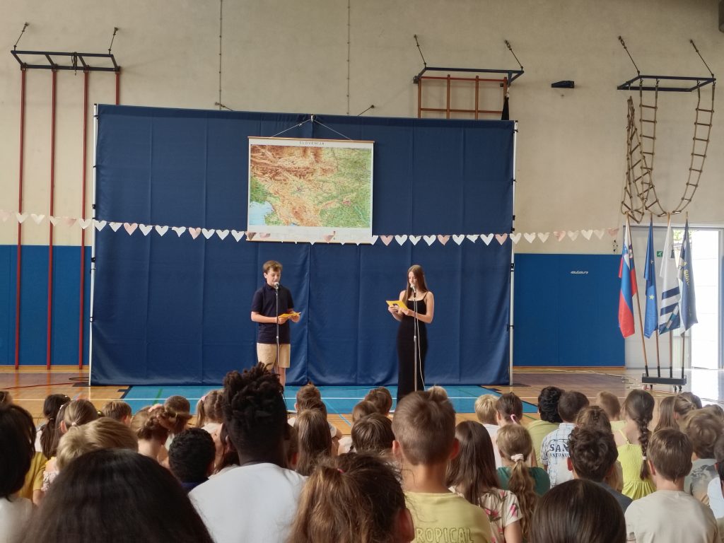 Proslava ob dnevu državnosti je potekala v torek, 24. 6. 2024, v šolski telovadnici. Proslavo so sestavljale pevske, plesne, igralske in glasbene točke, podelili pa smo tudi priznanja za najbolj pridne bralce in šolske nagrade – simone.