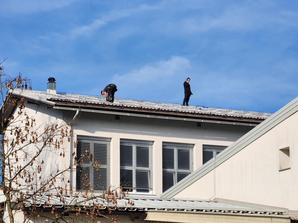 Z GENI-ja so nam sporočili, da se bodo danes začeli dela na šolski strehi in v šoli ( montaža sončne elektrarne) – zgradba šole in telovadnice.