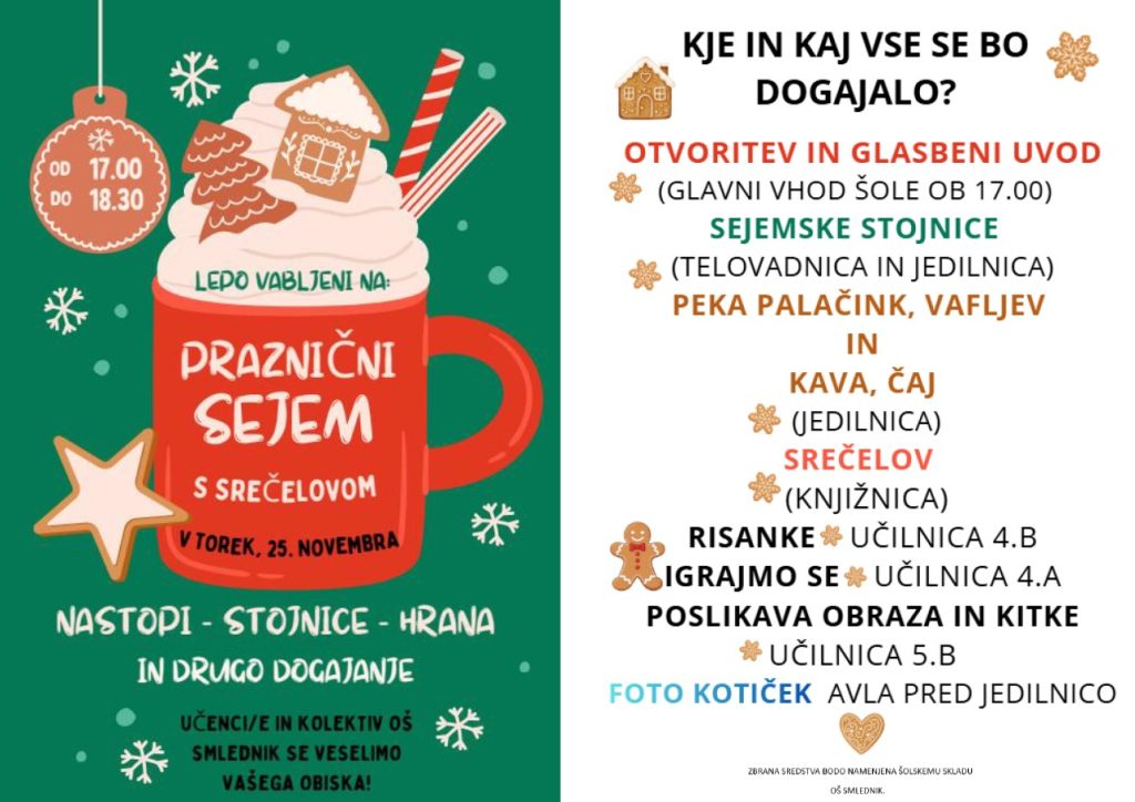 Lepo vabljeni na praznični sejem s srečelovom, ki bo v torek, 25. novembra ob 17.00 v prostorih šole.